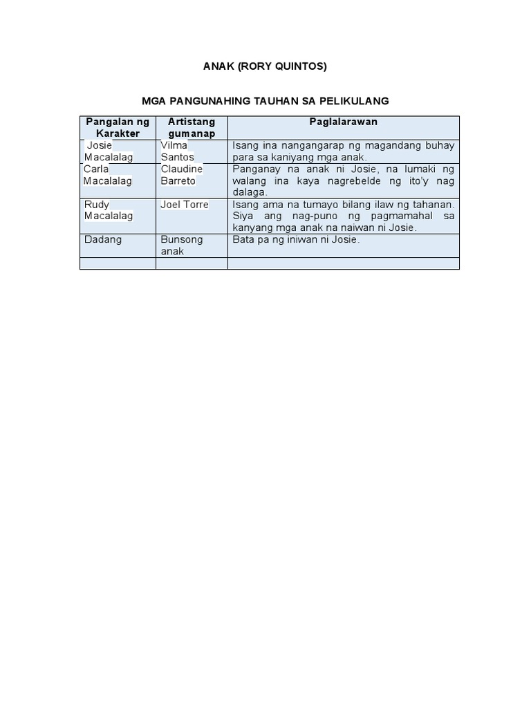 View Essay - TAUHAN SA PELIKULANG ANAKdocx from ENGLISH 1975 at Manuel L. Ito ang nakita ko sa pelikulang Anak 2000 ni Rory Quintos na pinagbibidahan nina Josie Vilma Santos at Carla Claudine Barreto. MGA PANGUNAHING TAUHAN SA PELIKULANG ANAK RORY QUINTOS Pangala Artistan Paglalarawan n ng g Karakte.