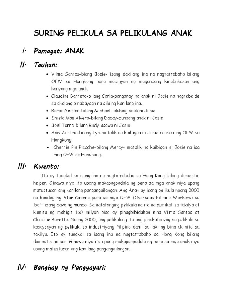 Tauhan at tagpuan ng pelikulang anak. View Essay - TAUHAN SA PELIKULANG ANAKdocx from ENGLISH 1975 at Manuel L. Ano-ano ang mga tagpuan sa pelikulang Anak pelikula ni Rory B. Quintos 1 See answer Advertisement Advertisement matt434 matt434 Ang Pelikulang Anak ay patungkol sa isang ina bilang Overseas Filipino Worker na napilitang umalis ng bansa upang mabigyan ng maayos na buhay ang kanyang pamilya.