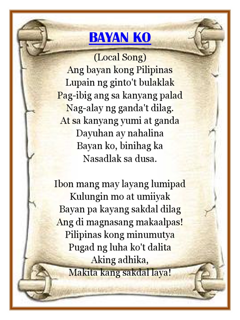 Bayan Ko was composed in 1928 when Filipinos were campaigning for independence from America under the leadership of President Manuel Quezon. Masterado sa Pagtuturo ng Filipino sa. Matapos nito ay lumipat ang eksena sa palayan at doon makikita ang mga magsasakang abala sa pagtatanim.