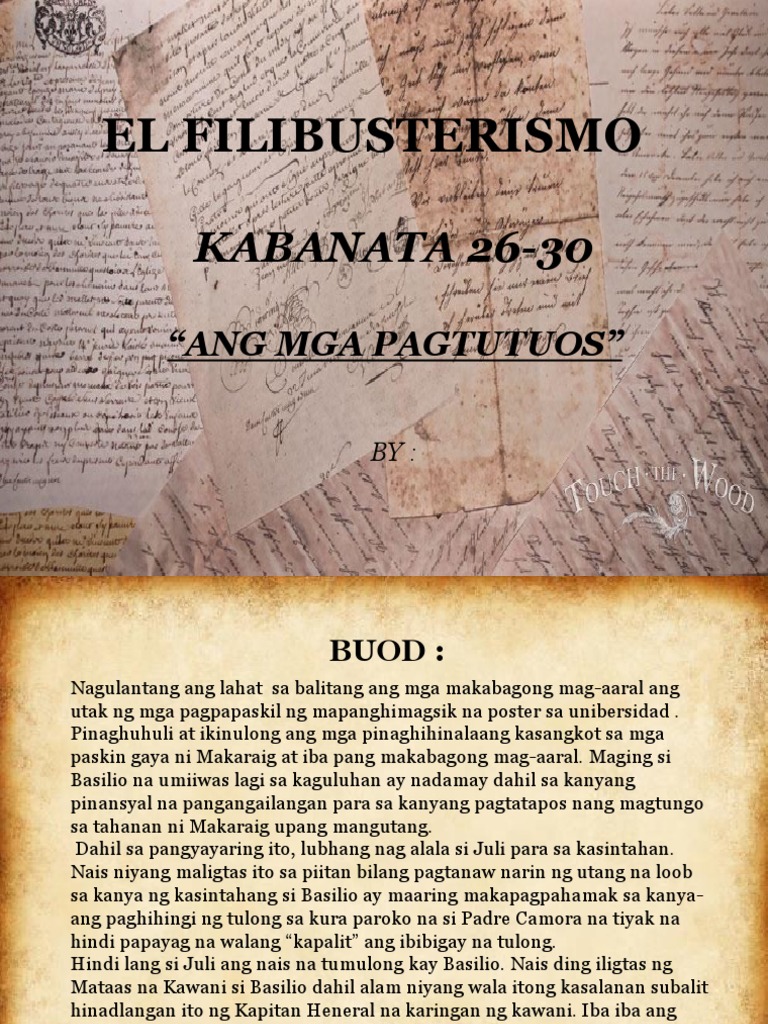 EL FILIBUSTERISMO SUMMARYBUOD Chapter 21 Mga Ayos- Maynila Magdiriwang ng ikaunang palabas ang samahan ng. Hindi nagpatinag si Juli sa kaniyang takot at lumapit pa rin sa pari para kay Basilio.