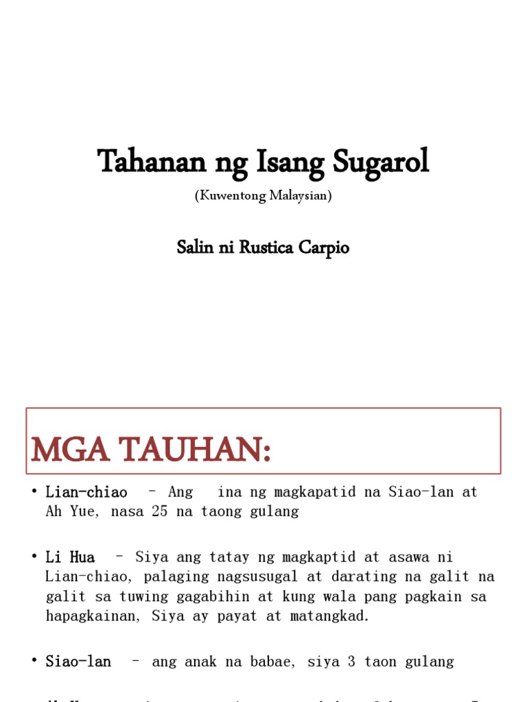Start studying Tahanan ng Isang Sugarol. Learn vocabulary terms and more with flashcards games and other study tools. Nasabi kong ito ang tema nito sapagkat sa kabuuan ng kwento ang pangunahing tauhan na si Lian-chiao ay naaabuso ng kanyang.