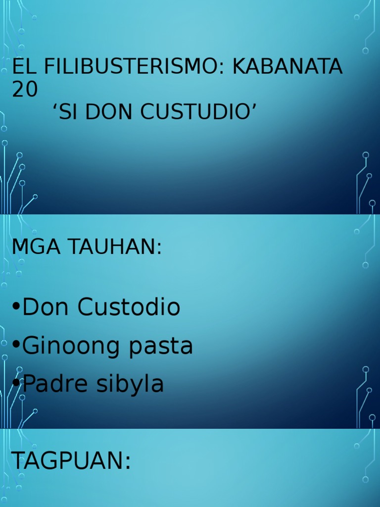 20 from the story El Filibusterismo by FilipinangKawaii PINAY with 14086 readsKabanata 20Si Don CustodioBuod Ang usapin ukol sa akademya ng. Jose Rizal the national hero of my country the PhilippinesNoli and Fili along with his other writings caused his death by firing squad on December 30 1898 or around 2 years before Spain sold the country to the United States of America. Si Don Custodio Kabanata 22.