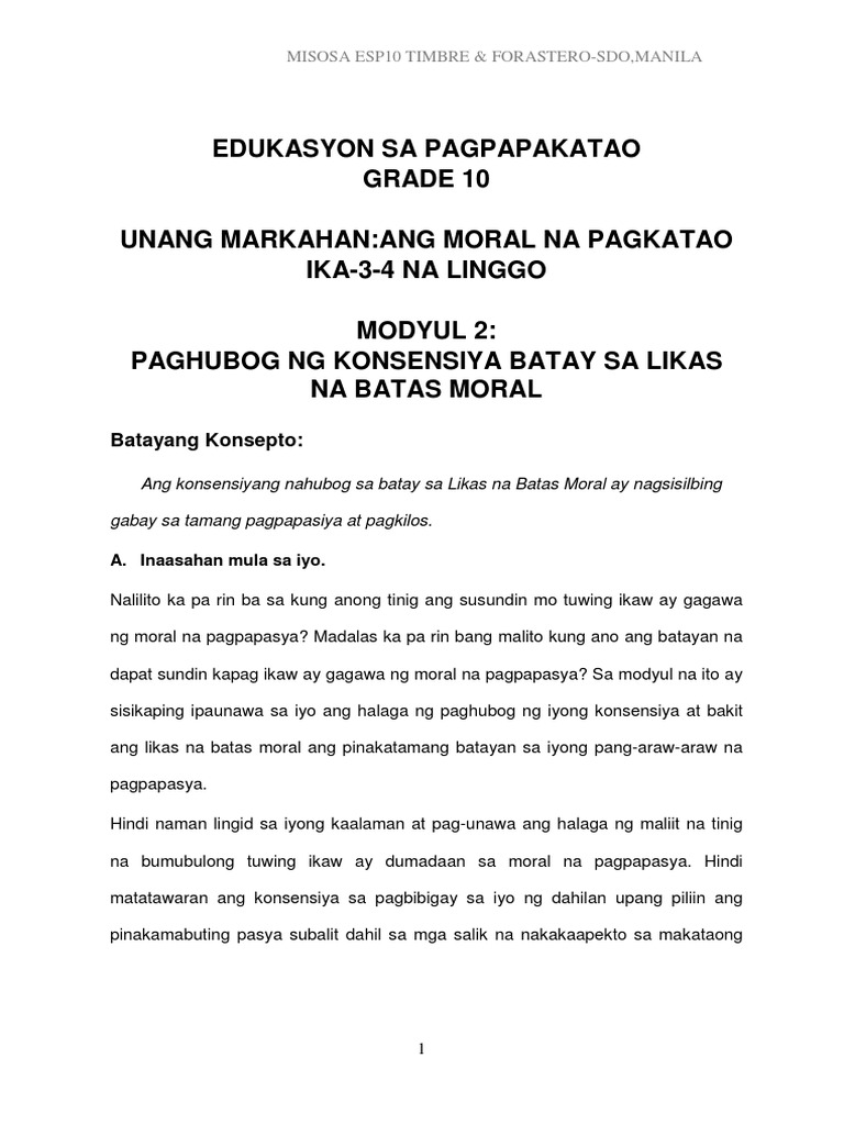 Esp 10 Q1 W3 W4 Mod2 Paghubog Sa Konsensya Batay Sa Likas Na Batas Moral Pdf