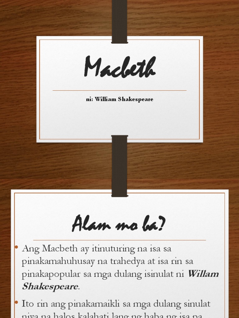 Ipinagsawalang bahala ito ni Macbeth dahil alam nyang lahat ng tao ay. Pumatay kay Haring Duncan sa kagustuhan ng kanyang asawa BANQUO isang heneral at kaibigan ni Macbeth. Nang tumagal ay nagsulat naman siya ng mga trahedya hanggang mga 1608 kabílang dito ang Hamlet Othello King Lear at Macbeth na mga tinuturing bílang ilan sa mga piakamahusay na akda sa wikang Ingles.