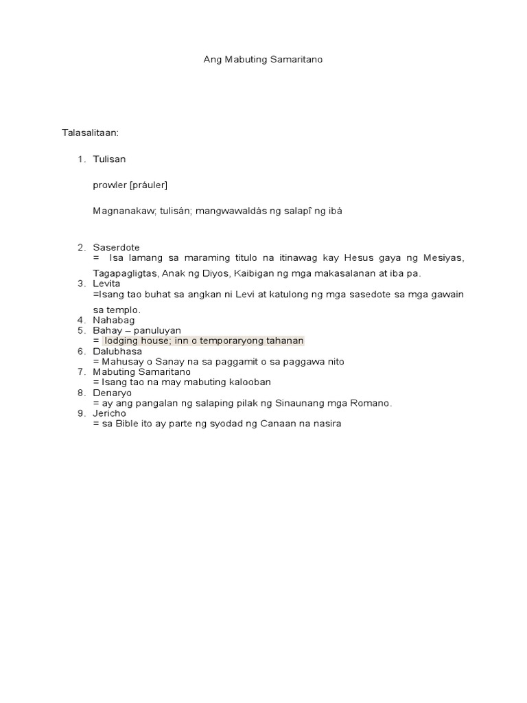 Tauhan ng ang mabuting samaritano. Guro ano ang dapat gawin upang magkamit ng buhay na walang hanggan sumagot si Hesus. Isang pari ang napadaan kung saan nakahandusay ang lalaki. The student is asked to underline the complete subject buong simuno o buong paksa in each sentence of the story.